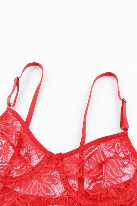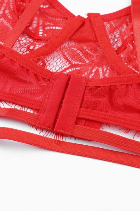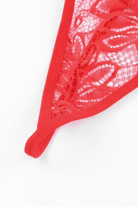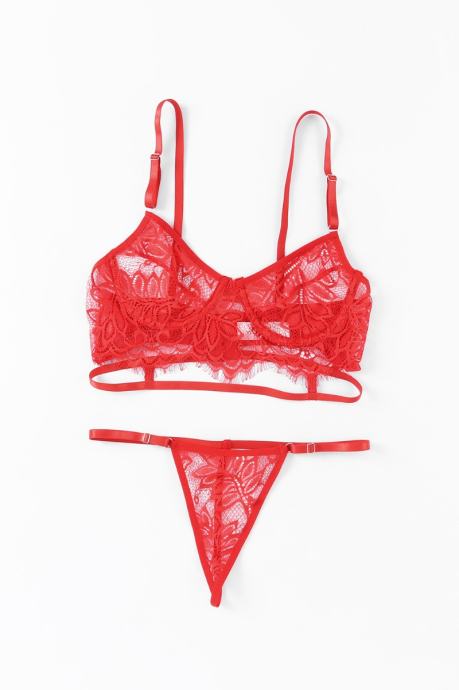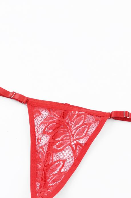 Kaj je lepšega kot rdeče perilo? Čipkasto rdeče perilo! Komplet Katherine je sestavljen iz nedrčka in tanga hlačk. Izdelan je iz mehke in raztegljive čipke, ki je izjemno udobna za nošenje, saj je prijazna do kože. Nedrček ima mehke košarice z žičnato oporo in nastavljive naramnice, zadaj se zapira na kaveljčke in ima okrasne trakove. Tanga hlačke so udobnega kroja in imajo nastavljiv obseg. - Trendovsko spodnje perilo - Rdeča čipka - Okrasni trakovi - 2- delni komplet - Nedrček z žičnato oporo - Mehke košarice - Nastavljive naramnice - Tanga hlačke z nastavljivim obsegom