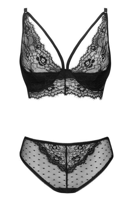 Ultra seksi komplet spodnjega perila v črni barvi, sestavljen iz dveh delov: nedrčka in udobnih spodnjic. Komplet je izdelan iz visokokakovostnega elastičnega materiala, ki odlično poudari ženstvene oblike in se prilagodi vsaki postavi. Nedrček je mehak, ima nastavljive naramnice in ima dva trakova na vratnem izrezu, ki preusmerita pogled na vaše čudovito oprsje. Mamljive čipkaste spodnjice v črni barvi so izjemno udobne in celotnemu outfitu dodajo piko na i, saj ustvarjajo pravo seksi vzdušje. Komplet je kot nalašč za vsakodnevno nošenje, kot tudi za malo bolj posebne trenutke. Čevlji niso vključeni.