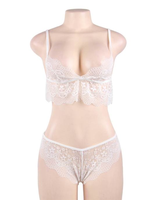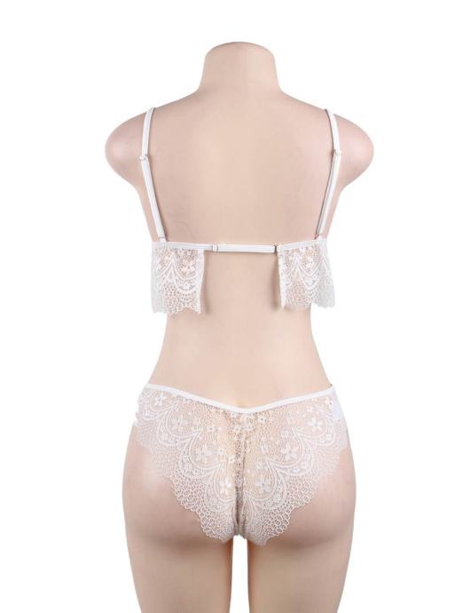 Eleganten komplet v beli barvi je vedno dobra ideja. Komplet R80614 je izdelan iz delikatne čipke in ima zelo lep ter udoben dizajn. Komplet vključuje nedrček z naramnicami in ter hlačke z brazilsko obliko, ki lepo poudari zadnjico. Komplet je na voljo v beli barvi in različnih konfekcijskih številkah za vsako žensko. Nedrček in hlačke Prosojna bela čipka Nastavljiva dolžina nedrčka na zadnji strani Brazilska oblika hlačk, ki oblikuje zadnjico