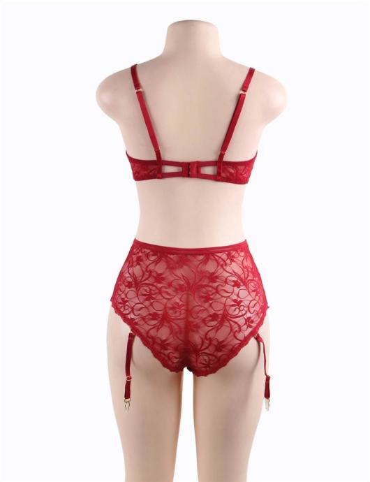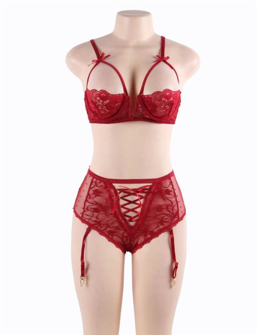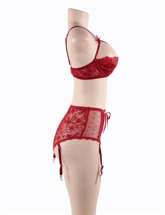 Zapeljite ga s čudovitim kompletom Ohyeah R80646. Dvodelni komplet je sestavljen iz nedrčka in hlačk ter je narejen v kombinaciji rdeče čipke in satenastih zaključkov, kar bo zagotovo pritegnilo poglede. Nedrček ima žičnato oporo, ki bo povzdignilo vaše prsi, polovične košarice in trak, ki obroblja oprsje. Naramnice so nastavljive in popolnoma prilagodljive. Hlačke imajo visok pas, ki vizualno zoži postavo in podaljša trup. Na sprednjem delu so prepleteni trakovi, ki dajejo videz steznika. Hlačke imajo tudi nastavljive trakove za pripenjanje nogavic. Zares čudovit komplet, ki ne sme manjkati v vašem izboru. Dvodelni komplet Nedrček z oporo Nastavljive naramnice Hlačke s trakovi za pripenjanje nogavic Visok pas Nežna čipka Rdeča barva Nogavice niso vključene