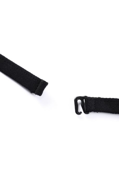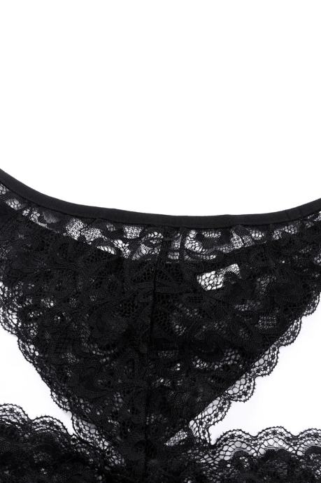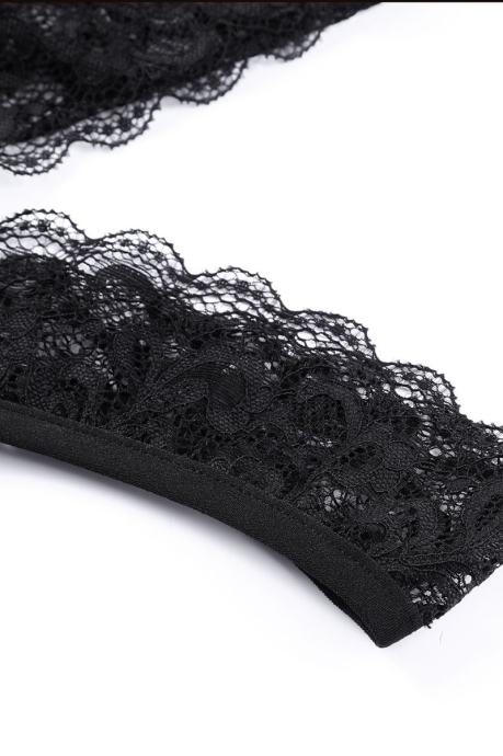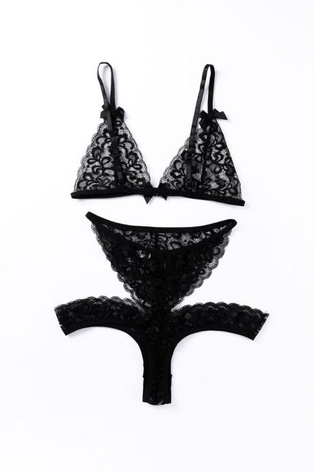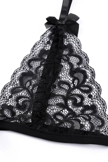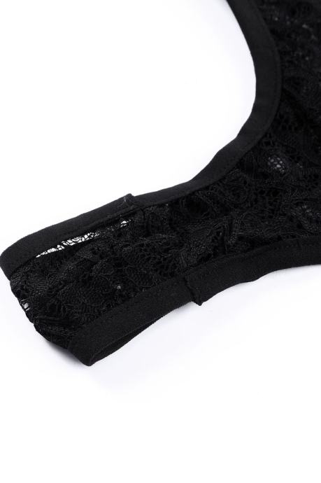 Očarljiv dvodelni komplet, s katerim lahko pokažete svojo romantičnost. Komplet je sestavljen iz nedrčka in tanga hlačk ter je izdelan iz zelo raztegljivega materiala. V celoti je izdelan iz čutne črne čipke. Nedrček ima mehke košarice, ki nežno objamejo vaše prsi ter tako pokaže vaše privlačne obline. Ima nastavljive naramnice in na prednjem delu okras s pentljo. Tanga hlačke imajo visok kroj in izrez, ki vas naredi izjemno seksi ter vizualno podaljša vaše noge. - Dvodelni komplet - Nedrček z nastavljivimi naramnicami - Tanga hlačke z visokim pasom in seksi izrezom - Čutna čipka in okras s pentljo - Črna barva