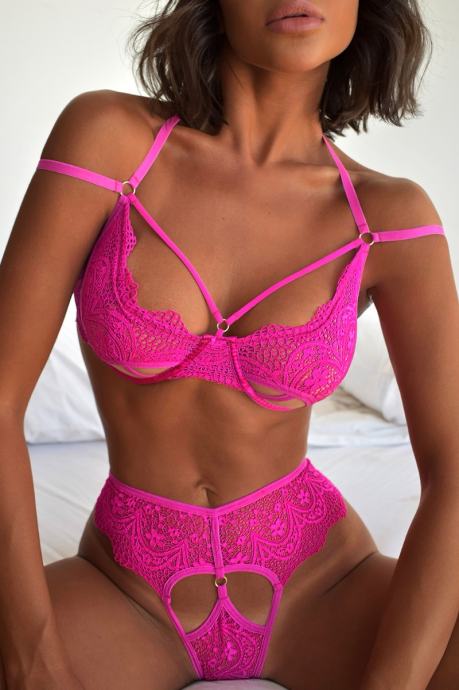 Komplet, ki bo prikazal vašo seksi in ženstveno plat. Reese je čudovit čipkast komplet v vroči pink barvi in ga sestavljajo nedrček ter tanga hlačke. Nedrček ima mehke košarice z žičnato oporo in trakove, ki obrobljajo košarice ter se nadaljujejo v preplet na ramenih in zadaj na hrbet. So nastavljive in si jih lahko popolnoma prilagodite po svojih oblinah. Tanga hlačke imajo visok pas, kar vizualno podaljša vaše noge. Komplet je izdelan iz mehkega in udobnega materiala. To je erotično perilo, ki vam bo zagotovo prinesel še več zabave in strasti.