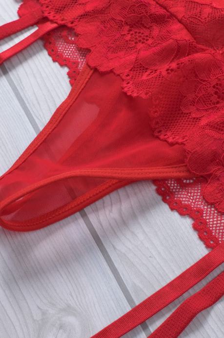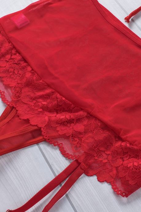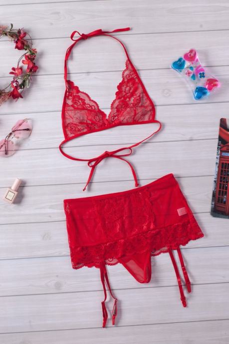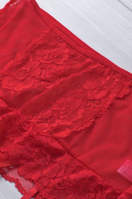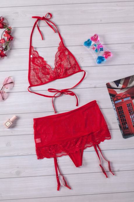 Poudarite svoje obline. Tri delni komplet erotičega perila vključuje nedrček, tanga hlačke in krilo s pasom za nogavice. Izdelan je iz mehkega in raztegljivega materiala, ki bo nežno objel vaše obline in izpostavil le najboljše. Nedrček se zavezujemo za vratom in na hrbtu ter nima podloženih košaric. Nežna čipka v rdeči barvi poudari vašo seksipilnost in vas naredi neustavljivo privlačne. Tri delni komplet Nedrček, tanga hlačke, krilo s pasom za nogavice Mehak in udoben material Nežna čipka Rdeča barva Nogavice niso vključene