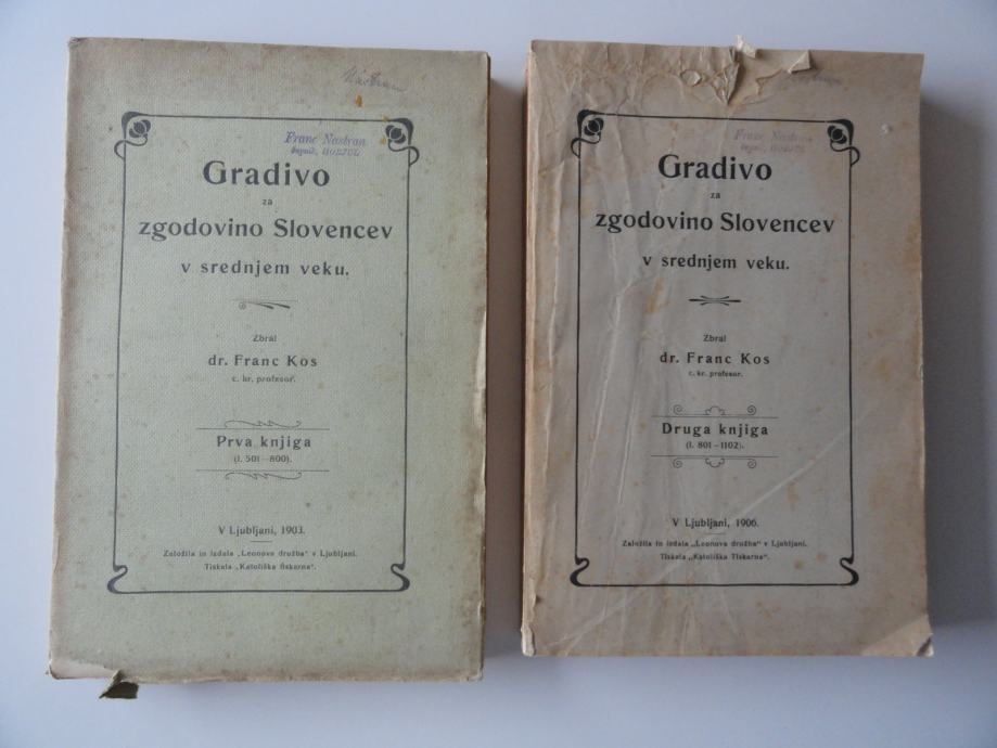 Knjigi GRADIVO ZA ZGODOVINO SLOVENCEV V SREDNJEM VEKU, 2 KNJIGI, 1903,1906, LEONOVA DRUŽBA LJUBLJANA, broširani, dobro ohranjeni, v kompletu obe za 120 eur.