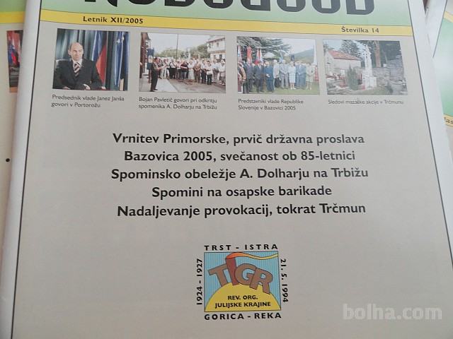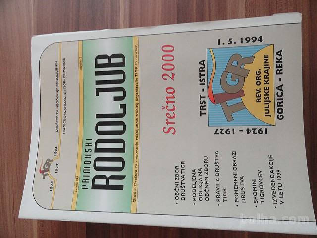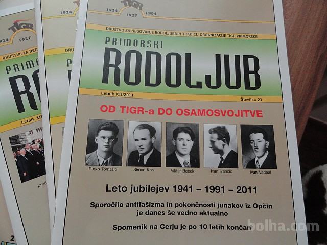 PRIMORSKI RODOLJUB, GLASILO DRUŠTVA ZA NEGOVANJE RODOLJUBNIH TRADICIJ ORGANIZACIJE TIGR PRIMORSKE (1924-1927-1994), PRVIH 20 ŠTEVILK, OD ŠT 2 DO ŠT 21 (vmes manjka številka 8, ter št 1) letnik od l. 1999 do l. 2011, gre za prve številke glasila (veliko čb fotografij, društva, spomeniki, govori, osebnosti, odličja, obletnice...), lepo ohranjene, SAMO v kompletu, cena za izvod 3 evre, torej skupaj 60 evrov.