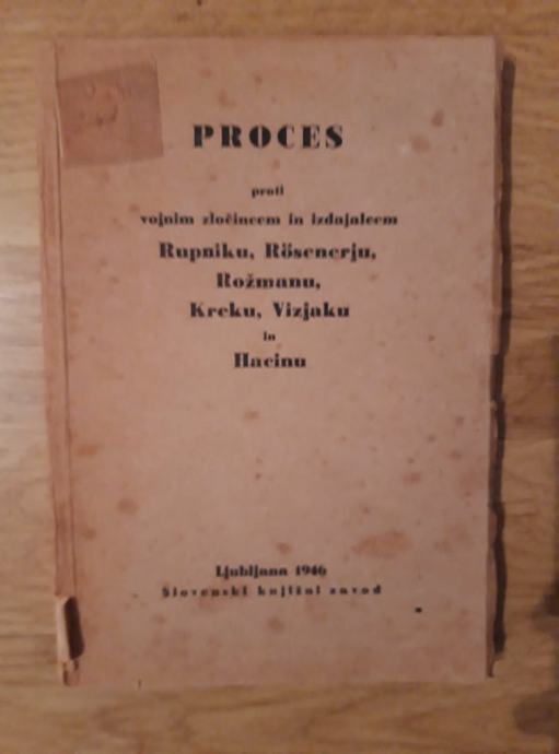 Prodam lepo ohranjeno knjigo PROCES PROTI VOJNIM ZLOČINCEM IN IZDAJALCEM - RUPNIKUM, ROSENERJU, ROŽMANU, KREKU, VIZJAKU IN HACINU, LJUBLJANA 1946