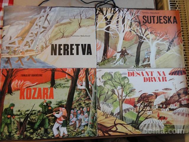 Knjige 4 VOJNE KNJIGE NOB ZA MLADINO - ODLOČUJOČE BITKE (SUTJESKA, NERETVA, KOZARA, DESANT NA DRVAR), TOMISLAV RAKOČEVIĆ, NIŠRO JEŽ BEOGRAD, v slovenskem jeziku, broširane, lepo in dobro ohranjene, samo v kompletu 4 knjige za 30 eur.