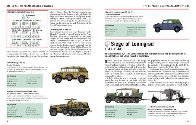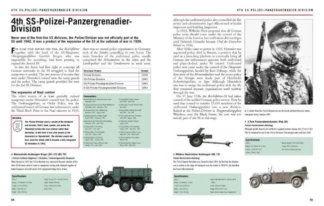 Organized chronologically by division and formation date, the book describes in depth the various models of tank and other armoured and soft vehicles in service with the ‘fighting’ SS, with listings of unit commanders, vehicle types and numbers and unit structure. Each divisional section is further broken down by campaign, accompanied by orders of battle, a brief divisional history of the campaign and any specific unit markings. Every SS division that saw combat is featured, from well-known units such as the elite Das Reich and Wiking divisions, to lesser-known divisions, such as the 11th Waffen SS Panzer Division Nordland and the Albanian-recruited 21st Waffen SS Gebirgs-Division Skanderbeg.