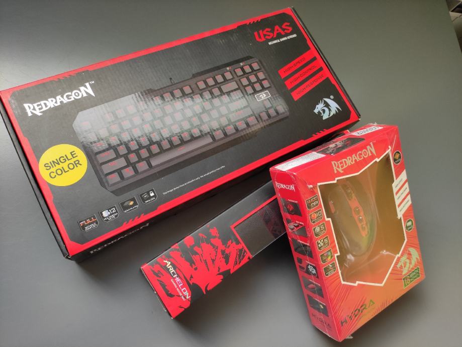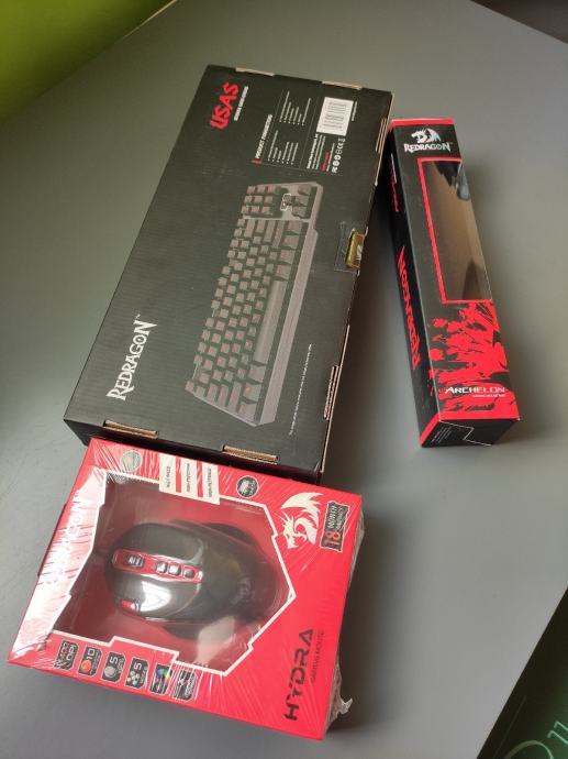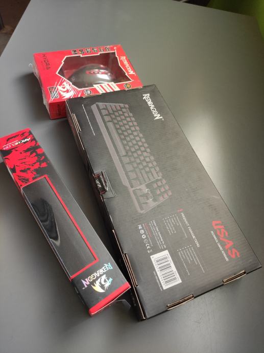 Nov še zapakiran gaming set: tipkovnica, miška in podloga. Vse znamke Redragon.