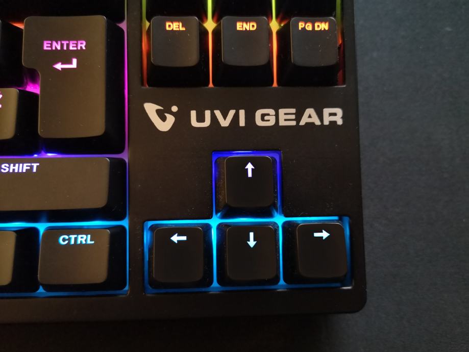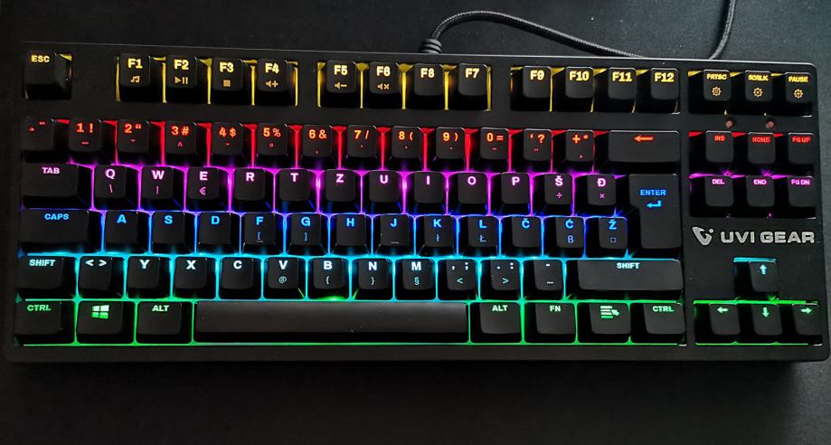 Gaming tipkovnica firme uvi gear. Ima linearne mehansko-optične tipke (originalno je imela clicky tipke ki sem jih zamenjal za tišje linearne) več o tipkovnici si lahko preberete na
