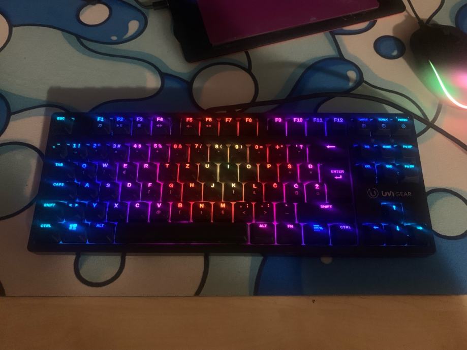 tipkovnica ima zelo malo delaya, blue switch kar pomeni da ima clicky tipke, je 100% size, ima nacine na vec mavricnih barv ali enobarvne. tipkovnica ima svoj driver, ko ga namestite na internetu na uradni strani uvi gear.