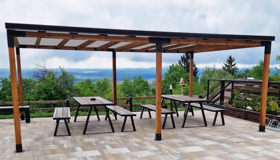 Nadstrešek po meri z kovinskimi povezovalnimi elementi in leseno konstrukcijo 100 x 100 mm.