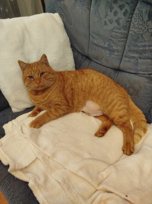 Sonček se je decembra 2024 pridružil koloniji prostoživečih muc. Pred časom sem opazila spremembo na njegovem telesu, povešen trebušček, kar je najverjetneje posledica močnega udarca. Ima abdominalno hernijo, ki je veterinarsko pregledana. Hernija trenutno ni sanirana, saj ima Sonček pretanko trebušno steno za klasično kirurško sanacijo. Zaradi njegove diagnoze življenje zunaj ni več primerno. Trenutno je pri meni na okrevanju. Po njegovem obnašanju sklepam, da je nekoč že imel dom. Saj je takoj osvojil kavč, mačji wc in dolga božanja. Je FIV in FEL negativen, čipiran, cepljenje še sledi. Po oceni veterinarke je star cca 3 leta.