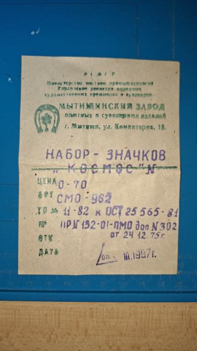 - Priložena originalna etiketa proizvajalca (Mytiščinski zavod, SSSR) z datumi in šifro izdelka