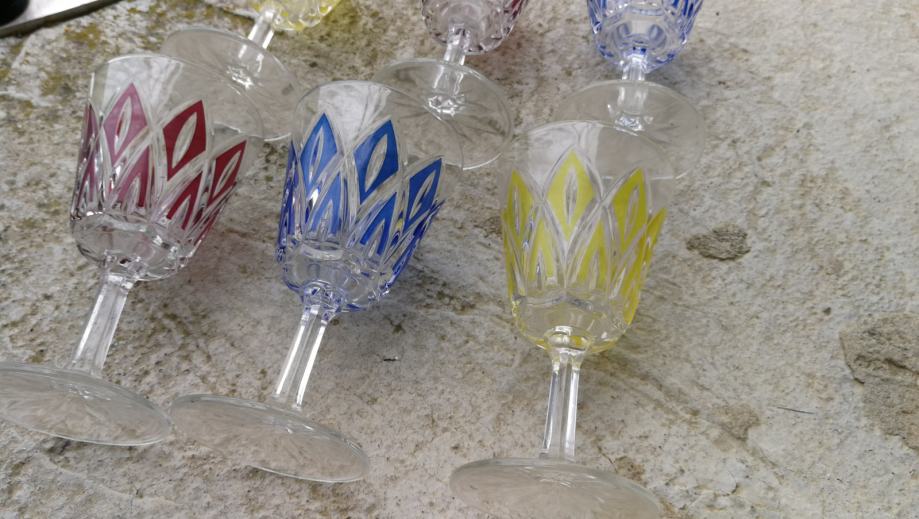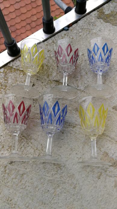 - set 6 kom barvni stekleni kozarci, kristalni kozarci? Kozarec na peclju, stari kozarci - lot za 15€,