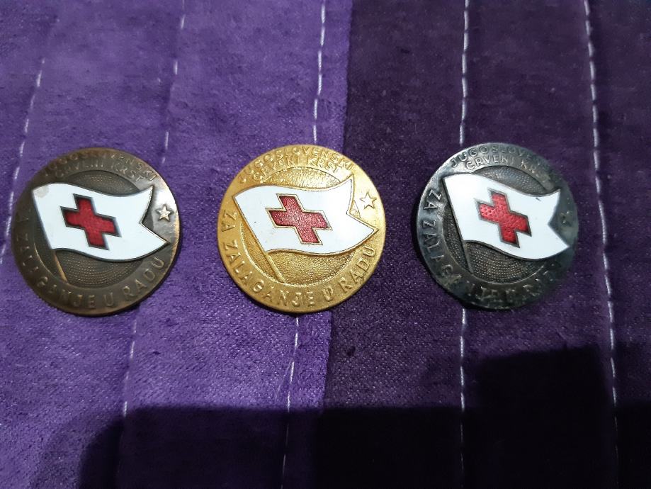 Tri emajlirane značke rdečega križa premer 30 mm in plaketa velikosti 9 x 7 cm v original škatli, prodam. Cena za vse 45 eur. Pošljem po pošti na stroške kupca.