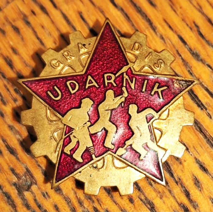 Prodam zelo redko oznako UDARNIK - GRADIS, premera 35 mm, v konici desnega kraka zvezde je email rahlo poškodovan.