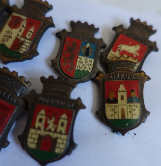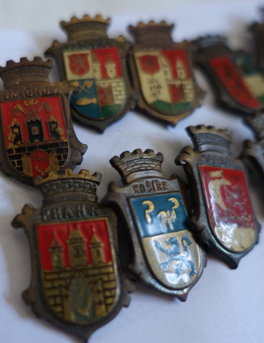 Značke z napisom in grbi Prage in ostalih čeških mest.