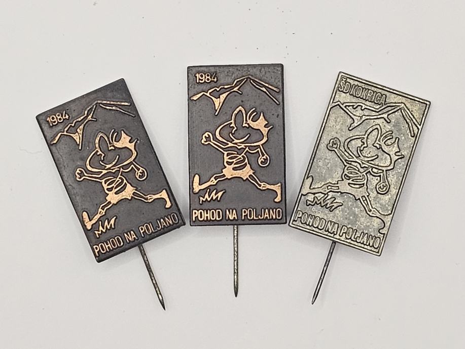 Značke pohod na Poljano – dve bronasti z letnico 1984 in ena srebrna z oznako ŠD Kokrica