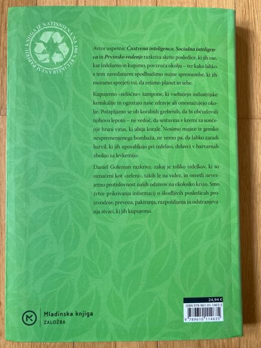 Daniel Goleman razkriva, zakaj je toliko izdelkov, ki so označeni kot »zeleni«, takih le na videz, in osvetli neverjetno protislovnost naših odzivov na ekološko krizo. Smo žrtve prikrivanja informacij o škodljivih posledicah proizvodnje, prevoza, pakiranja, razpošiljanja in odstranjevanja stvari, ki jih kupujemo.