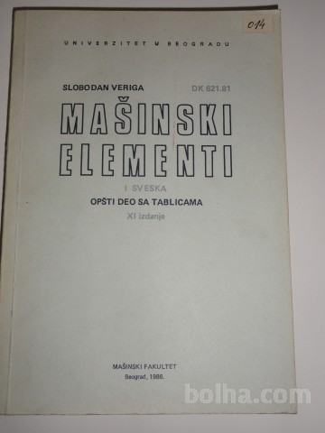 Knjiga MAŠINSKI ELEMNTI, 1 SVESKA, SLOBODAN VERIGA, MAŠINSKI FAKULTET BG 1986, v srbohrvaškem jeziku, broširana, 237 strani s slikami, dobro ohranjena.