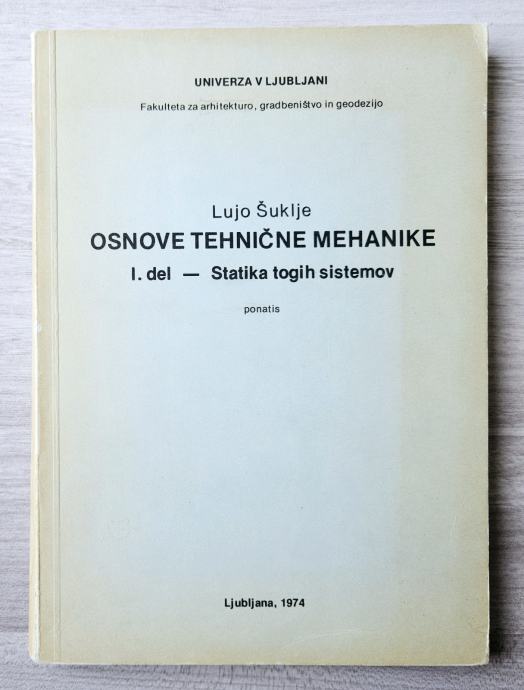Prodam knjigo OSNOVE TEHNIČNE MEHANIKE - 1. DEL - STATIKA TOGIH SISTEMOV, Lujo Šuklje, Univerza v Ljubljani 1974, mehka vezava. 178-