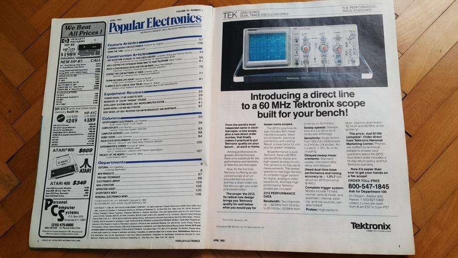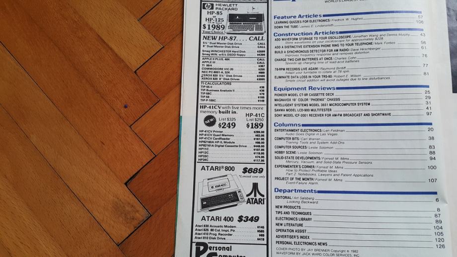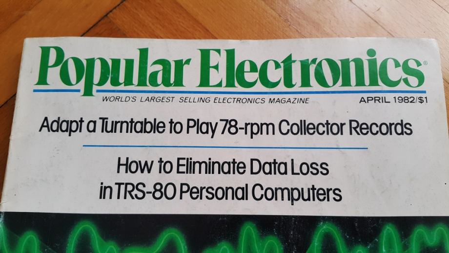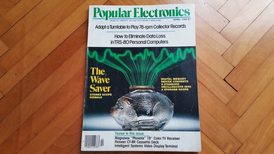 Prodam revijo Popular Electronics, izdaja april, letnik 1982 (Volume 20, No. 4). Last je bila Očeta, ki/kateri pa zaradi upokojitve in drugih zdravstvenih omejitev nima z njo več kaj za počet. Zato, preden jo trajno odvozim na Dinos, bom poskusil še tukaj, če bi komu kaj prav prišla. Je kar lepo ohranjena, nič ni kaj strgano ali kaj podobnega, tisk (berljivost, ohranjenost črk) je še več kot odličen. Kar se tiče pa uporabnosti znanja v njej pa presodite sami po posnetku kazala le-te v oglasu.