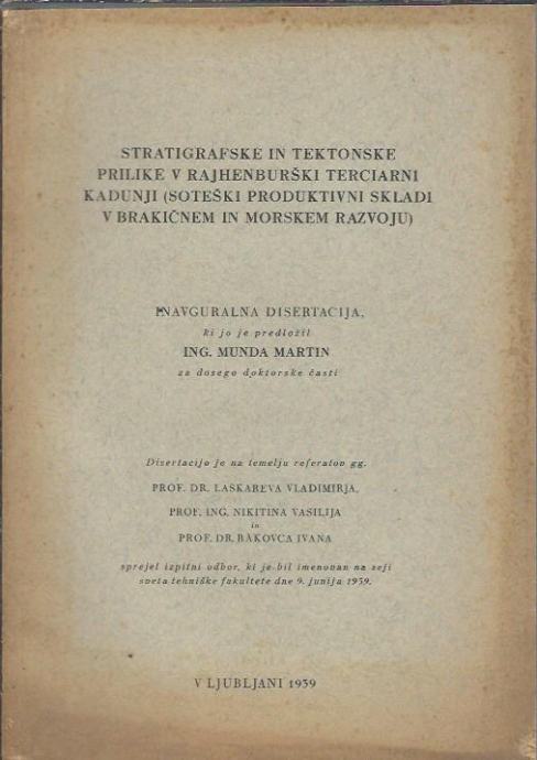 Naslov Stratigrafske in tektonske prilike v Rajhenburški terciarni kadunji (soteški produktivni skladi v brakičnem in morskem razvoju) : inavguralna disertacija, ki jo je predložil ing. Munda Martin za dosego doktorske časti