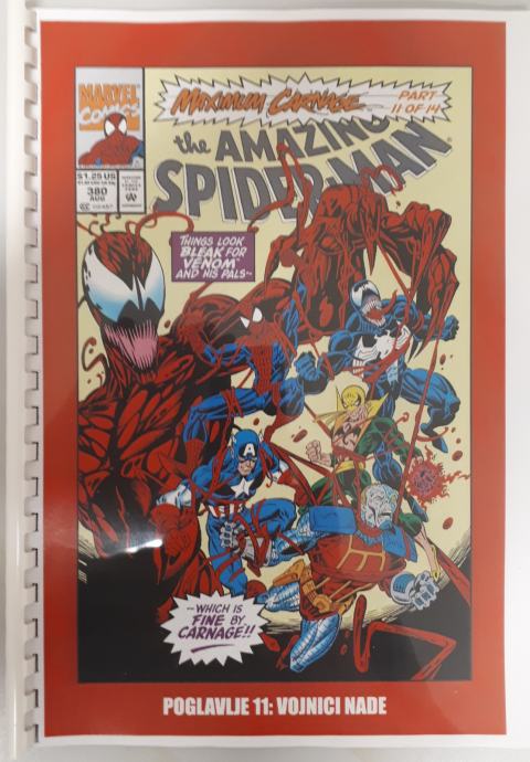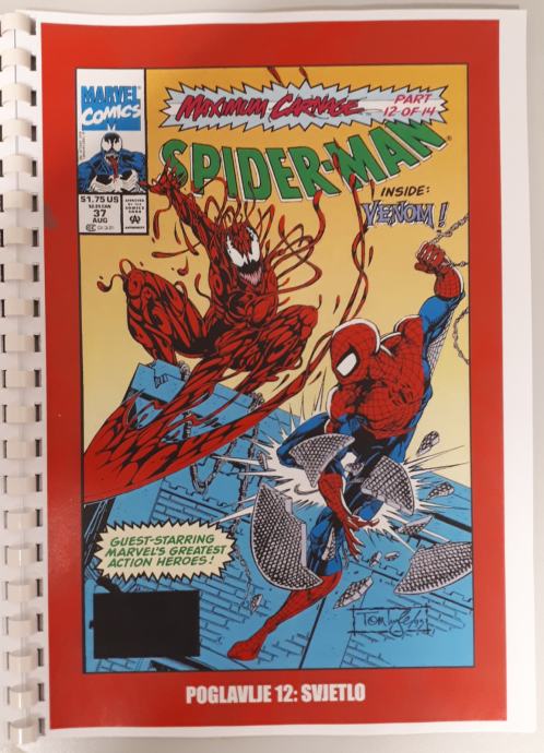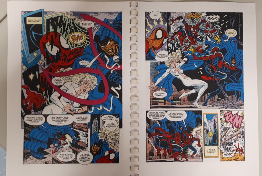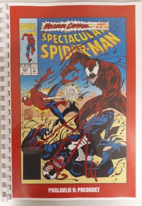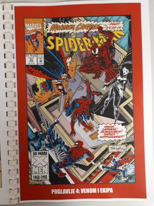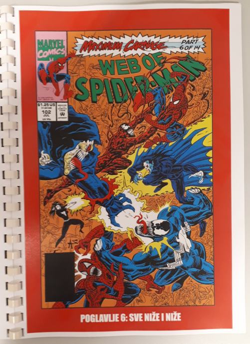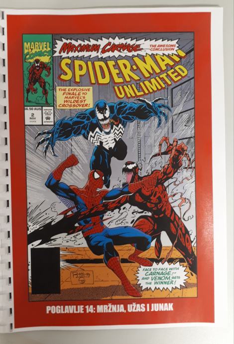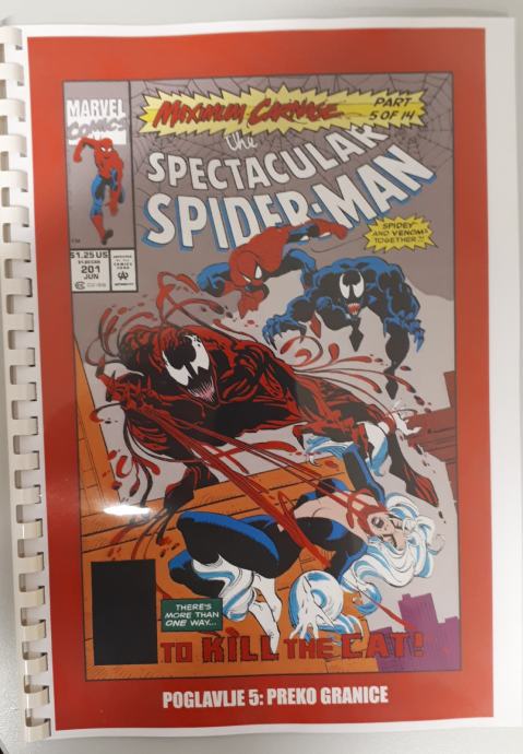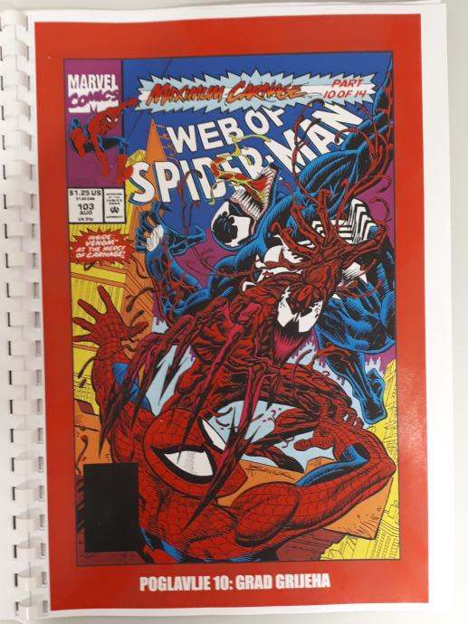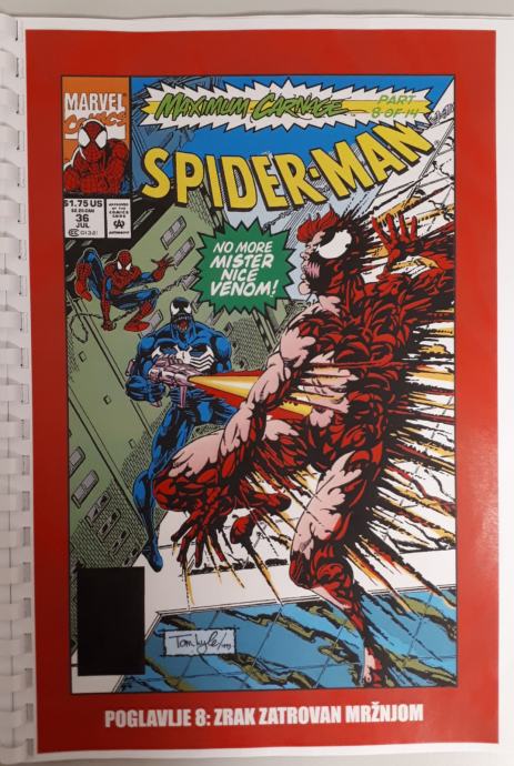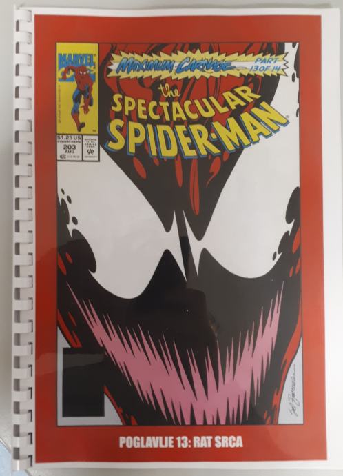Prodam zbirko doma narejenih 14 stripov Spiderman - Ultimate Carnage,kjer je celotna zgodba o nastanku Carnageja ter Spidermanov boj z njim ter Carrionom, Demogoblinom,Doppelgangerom,Shriekom . Ker je boj prehud za Spidermana se mu pridružijo Kapitan Amerika,Črna mačka,Cloak in Dagger in na koncu še Venom. Strip je preveden iz angleščine in ni bil nikoli objavljen na področju Yuge v srbščini.
