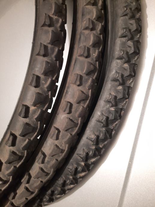 Prodam dva plašča 26"col(dimenzije:26 X 1,90 44 - 559) enakih profilov kot nova,(skrajno desnega ni več) za gorsko kolo lahko tudi za cestno kolo,cena za