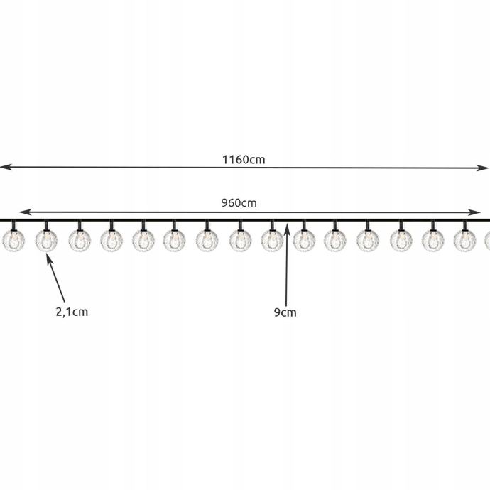 Topla rumena svetloba Kroglice v girlandi oddajajo toplo belo svetlobo, zaradi česar so idealne za ustvarjanje atmosferske osvetlitve. Vsaka kroglica je postavljena v razmaku 9 cm, kar zagotavlja enakomerno porazdelitev svetlobe po celotni dolžini girlande. Dobro premišljen dizajn girlande dopolnjuje 1.160 cm dolg temno zelen kabel, ki se popolnoma zlije z okolico in postane skoraj neviden na ozadju vegetacije, kar vam omogoča, da vso pozornost usmerite na svetleče krogle.