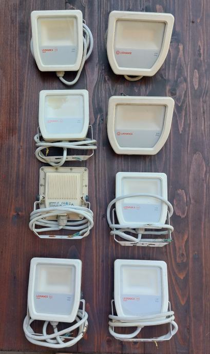 Prodam 8 Osram LED zunanjih reflektorjev, bili so povezani zaporedno, skupna dolžina kabla cca 18 m, podrobnosti na slikah.