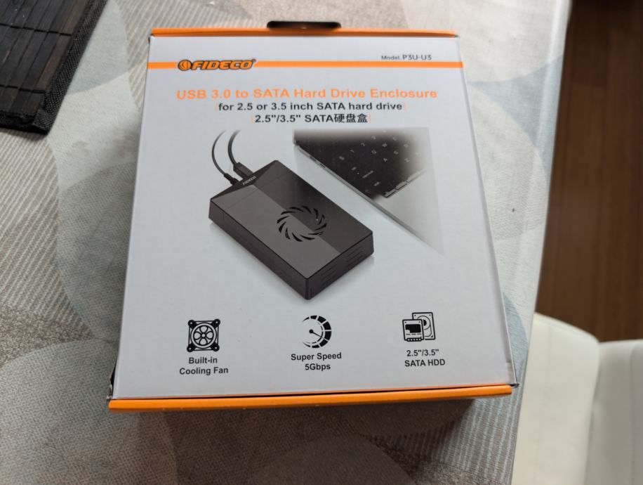 Brezhiben zunanji disk z ventilatorjem, napajlanim in podatkovnim kablom z orginal embalažo ohišja. Dokupljena podaljšana garancija.