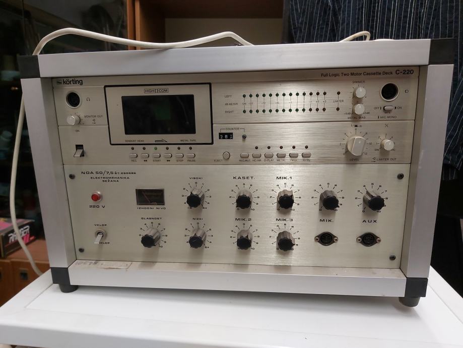 Porodam ojačevalec z vgrajenim kasetofonom, izdelek Elektromehanike Sežana iz 80 let. Ojačevalec je moči 75 W in ima 4ohmski in visokonapetostni izhod in je narejen v tehnologiji diskretnih elementov. Končna stopnja so verjetno darlingtoni 2N....., teža kakšnih 25 kg. Cena ni zadnja, lahko menjava za ravno fitnes klop.
